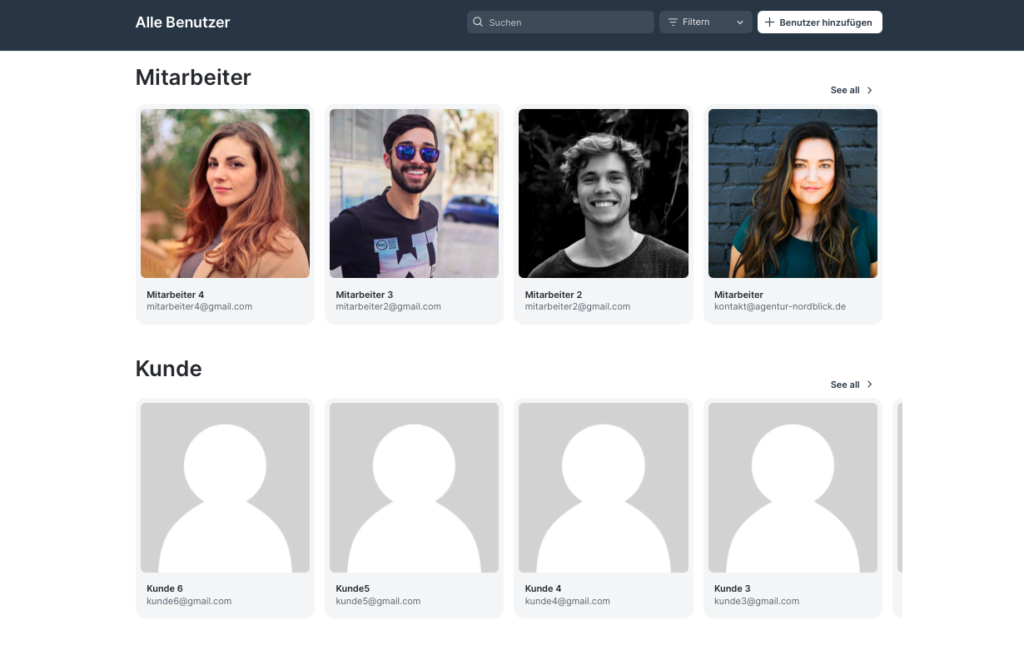 Alle Kunden und Mitarbeiter im Überblick – Maximale Organisation und Effizienz. Alle Kunden und Mitarbeiter im Überblick – Maximale Organisation und Effizienz. Durch eine zentrale Verwaltung behalten Sie nicht nur den Status Ihrer Projekte im Auge, sondern stärken auch die Kundenbindung und steigern die Zufriedenheit Ihrer Kunden durch transparente Kommunikation.